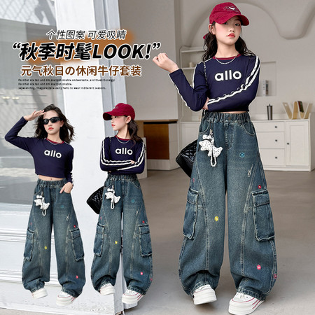 1*5收藏“2569款刺绣花朵牛仔工装弯刀裤套装”
