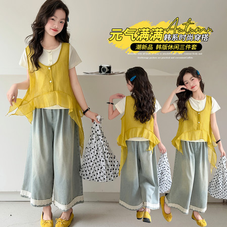 1*2收藏“2630款叠穿飘纱T恤加牛仔裤三件套”